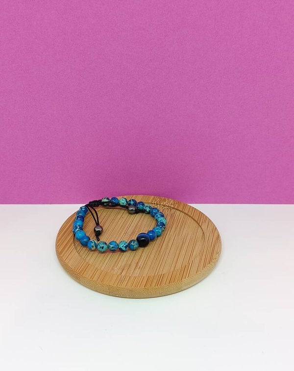 Découvrez l’élégance naturelle et l’énergie vibrante de ce bracelet unique, entièrement confectionné à la main la fermeture est en macramé . Ses perles de Jaspe impérial bleu, réputées pour favoriser la sérénité, la confiance en soi et l’équilibre intérieur, s’associent harmonieusement à une pierre d’Œil de tigre bleu, pierre de protection et de clairvoyance, qui aide à renforcer le courage, la concentration et la détermination.