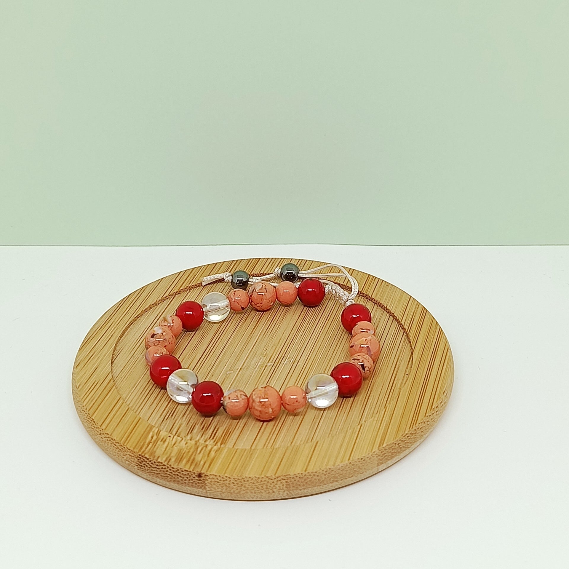 Bracelet en pierres naturelles howlite coquillage orange, cristal de roche et agate rouge – fermeture macramé – bijou fait main – Thyraë
