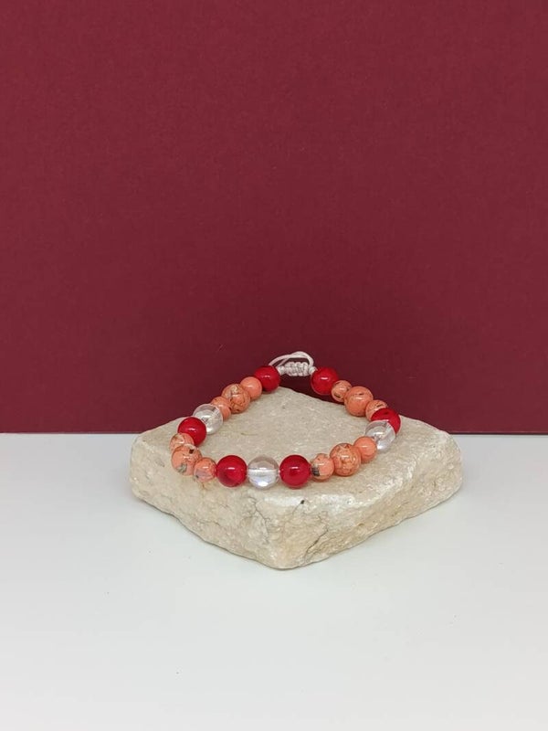 Composé de howlite coquillage orange aux teintes chaleureuses, d’agate rouge profonde et de cristal de roche lumineux, ce bijou crée un équilibre harmonieux entre calme intérieur et dynamisme. Une association idéale pour apaiser le mental tout en soutenant l’élan et la motivation au quotidien.
