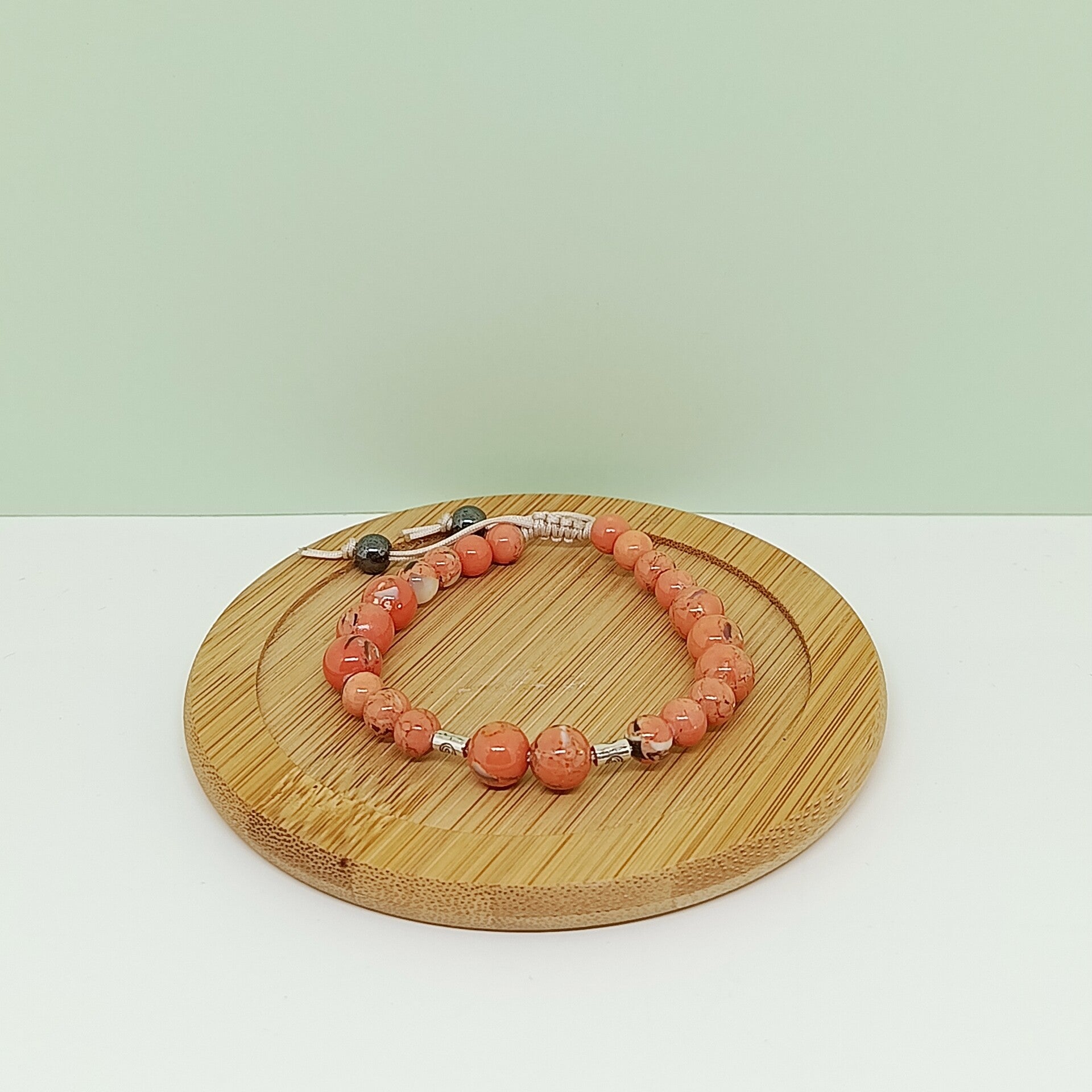 Alliant élégance et bien-être, ce bracelet en pierres naturelles est réglable et personnalisable avec vos pierres préférées. la howlite coquillage orange apaiserai l'esprit, réduidait le stress , stimulerait la créativité et apporterait vitalité et joie. Les breloques dorées ajoutent une touche délicate et raffinée à ce bijou unique.