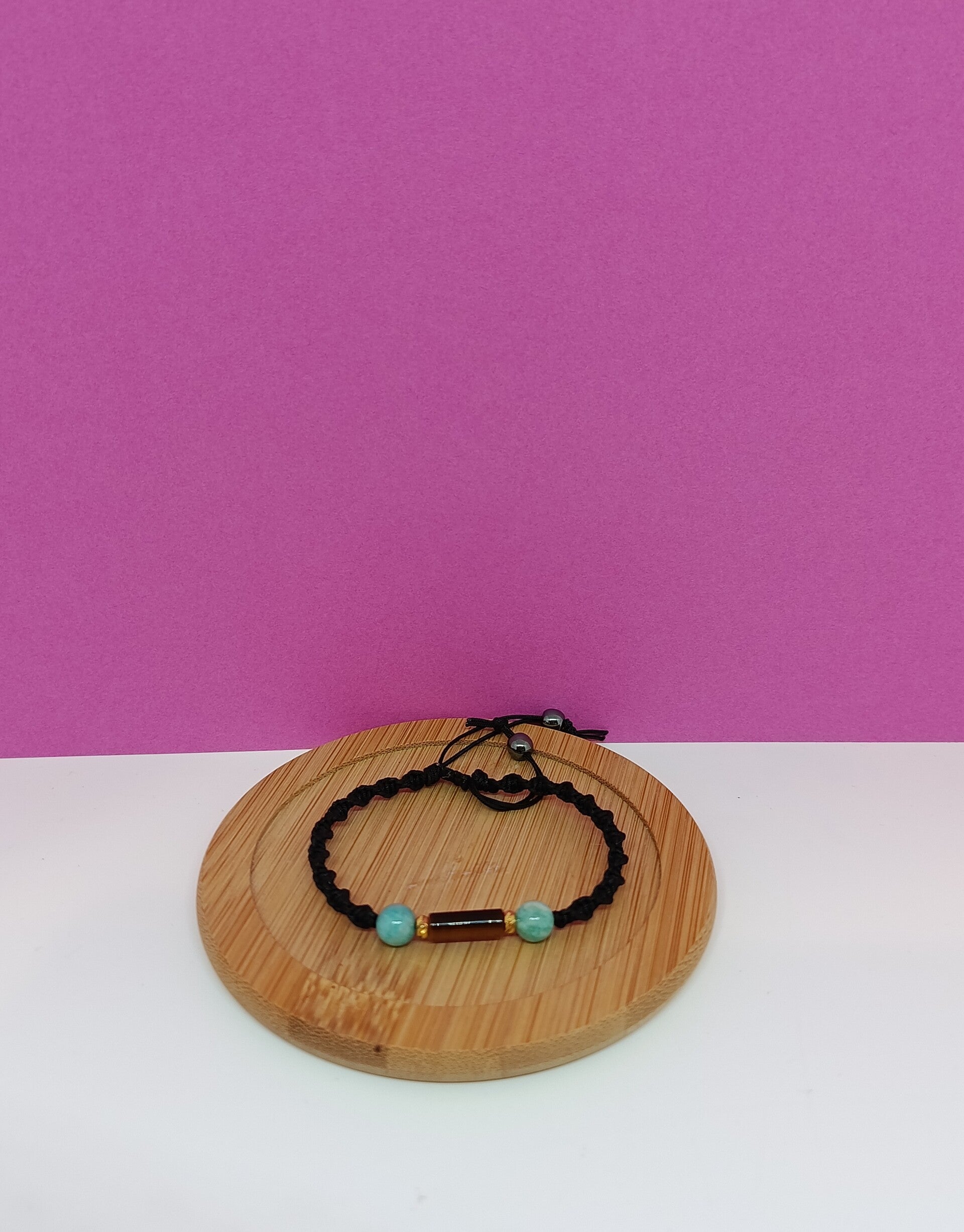 Ce bracelet en macramé finement tissé à la main allie délicatesse et énergie naturelle. Son tissage soigné met en valeur de belles pierres d’amazonite, composées de deux perles rondes en amazonite rondes subtilement associées à une perle tube en œil de tigre, apportant caractère et élégance à l’ensemble.