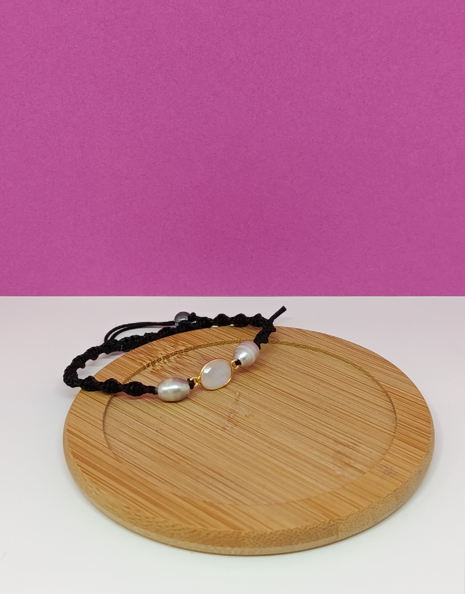 Ce joli bracelet en macramé noir est entièrement tissé à la main avec soin. Son design délicat met en valeur, en son centre, une pierre de lune lumineuse, sertie dans un intercalaire en plaqué argent doré. De chaque côté, de fines perles de culture d’eau douce viennent apporter une touche d’élégance et de douceur à l’ensemble.