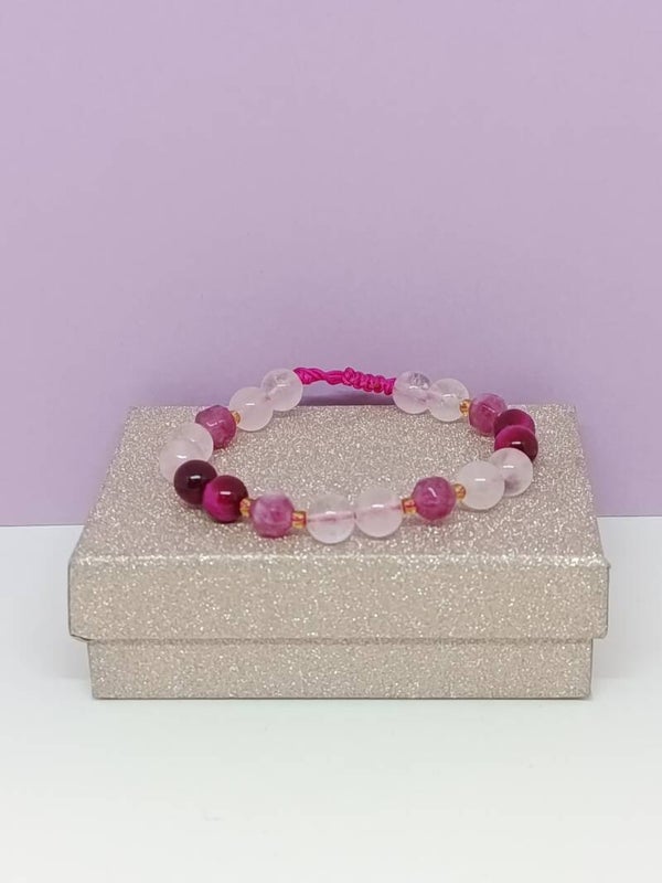 Ce bracelet délicat, aux nuances de rose subtilement relevées de touches dorées, est une création unique pensée pour allier élégance et énergie apaisante.