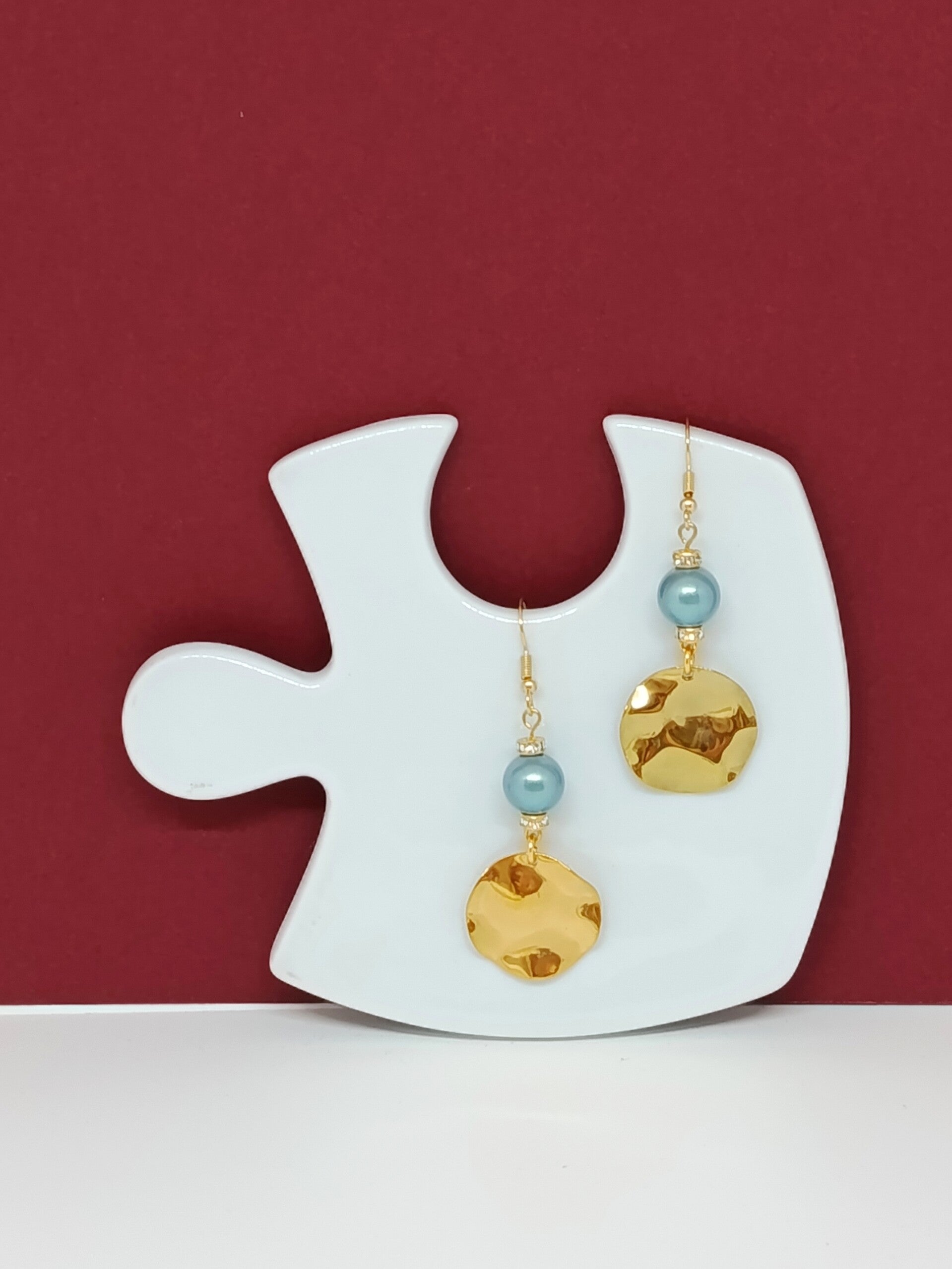 Montées sur des attaches en acier inoxydable pour un confort optimal, ces boucles dévoilent une harmonie délicate : une rondelle dorée sertie de cristaux, une perle de cristal bleu nacré de 8 mm, suivie d’une seconde touche scintillante, et sublimées par une plaque dorée martelée au caractère lumineux.