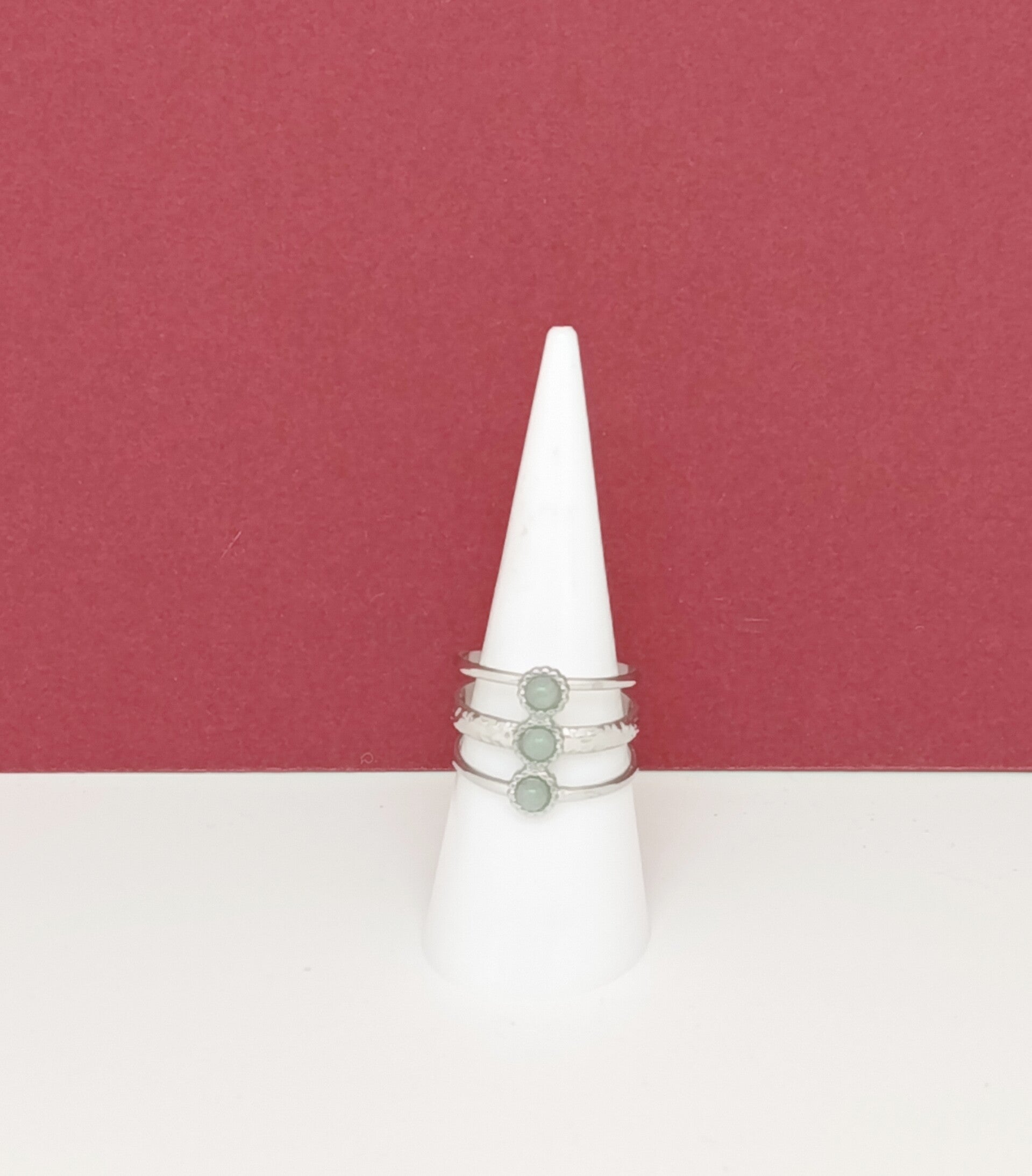 Élégante et délicate, cette bague en acier inoxydable multi rangs argenté est ornée de pierres d’aventurine aux douces nuances vertes naturelles, soigneusement serties à la main. Chaque pierre, en cabochon de 3 mm, révèle des variations uniques qui apportent fraîcheur, harmonie et authenticité à ce bijou intemporel.