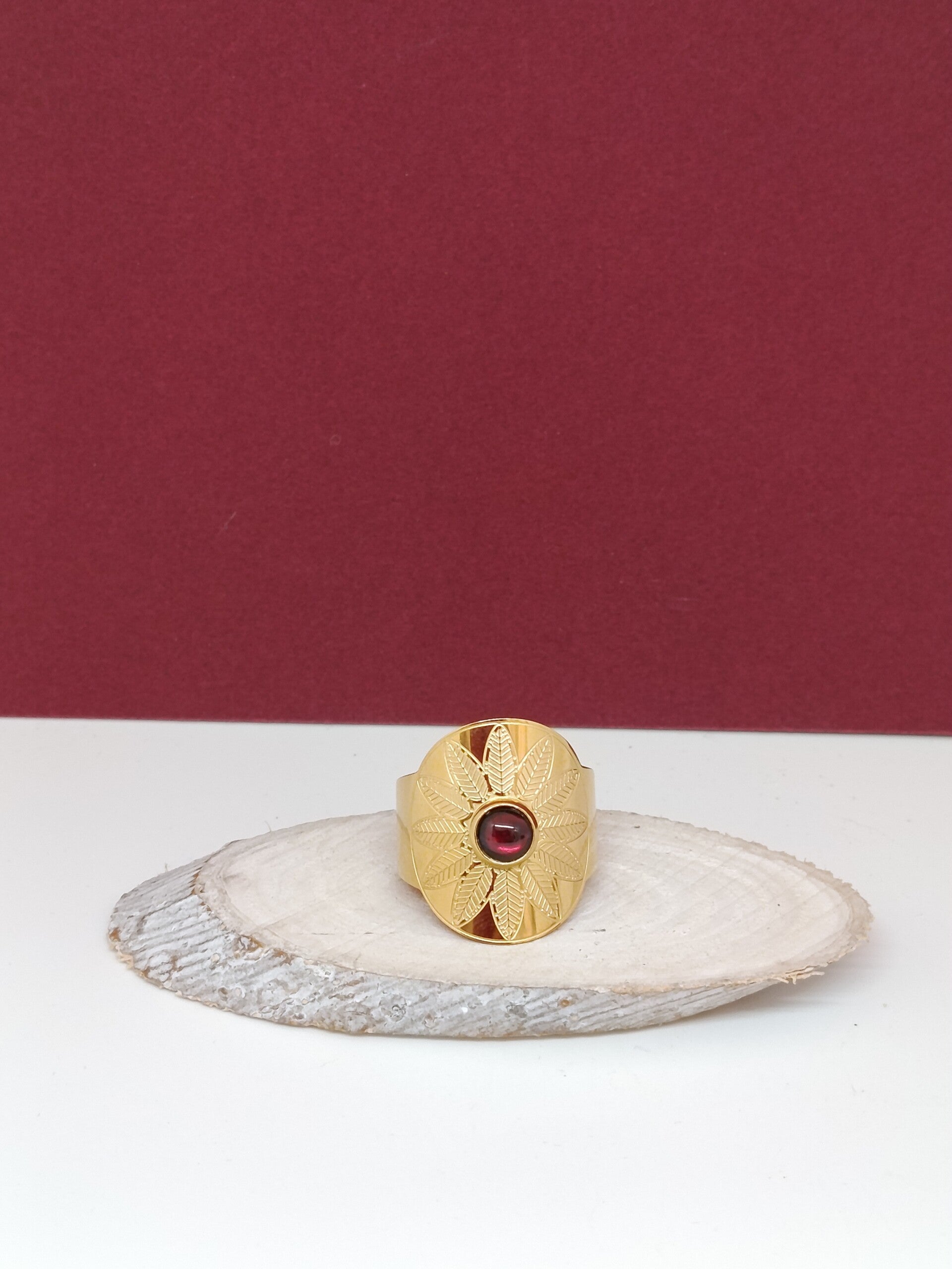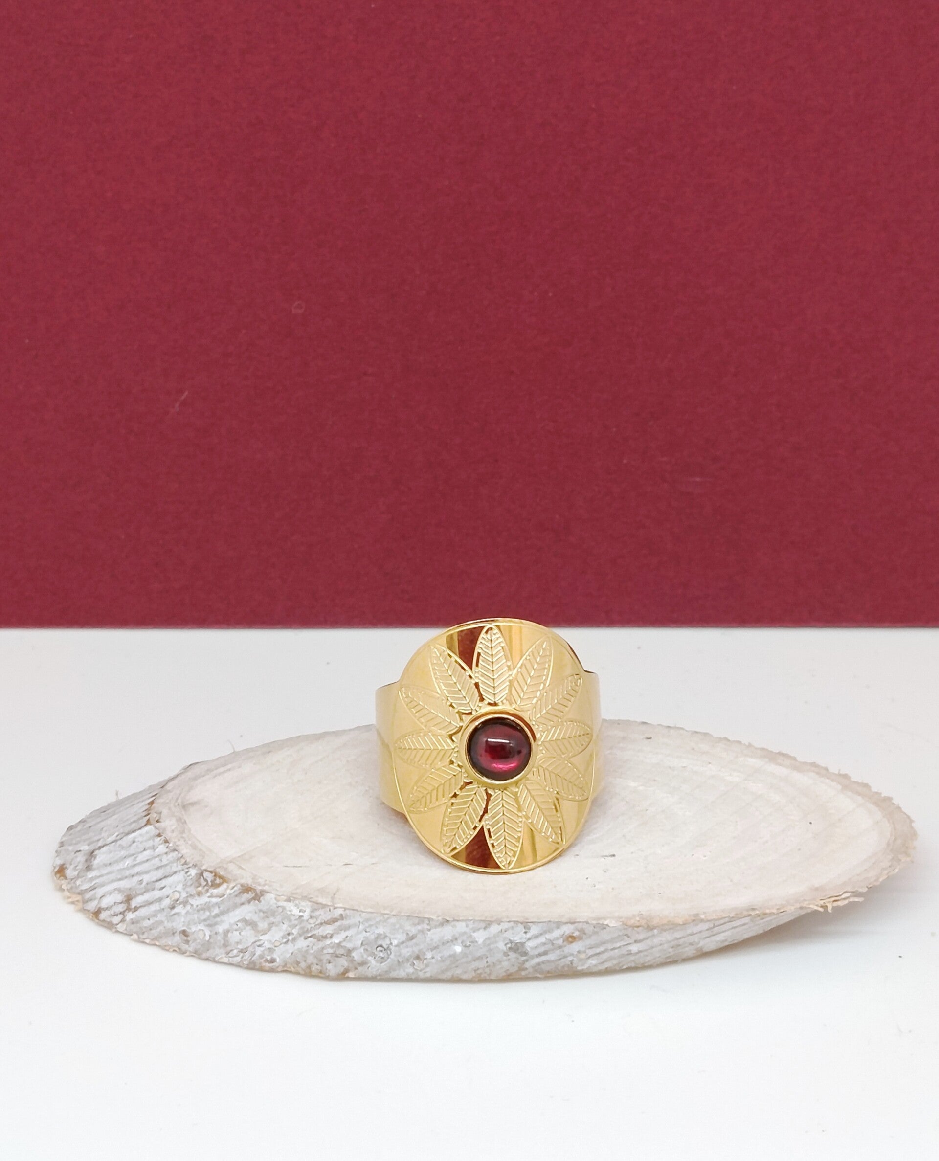En son centre, un grenat naturel en cabochon rond de 6 mm révèle de profondes nuances rouges, symbole d’énergie et de vitalité. Il est délicatement mis en valeur par un motif floral raffiné, aux pétales inspirés de feuilles finement sculptées, pour un rendu à la fois bohème et élégant.