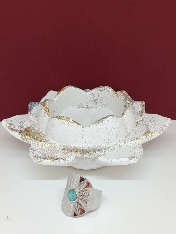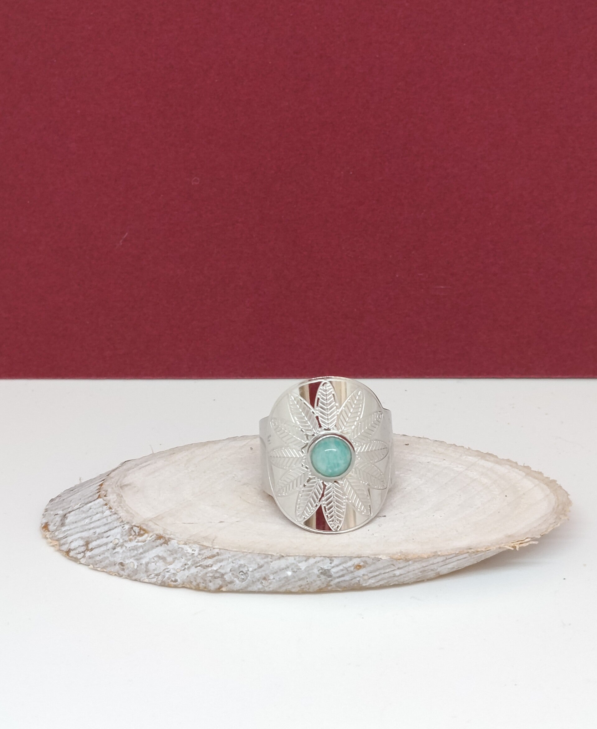 Au centre, une amazonite naturelle en cabochon rond de 6 mm illumine la bague de ses douces nuances vertes et apaisantes. Elle est sublimée par un motif floral délicat, inspiré de feuilles d’arbre finement sculptées, apportant une touche bohème chic et naturelle.