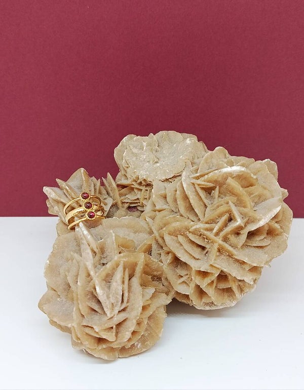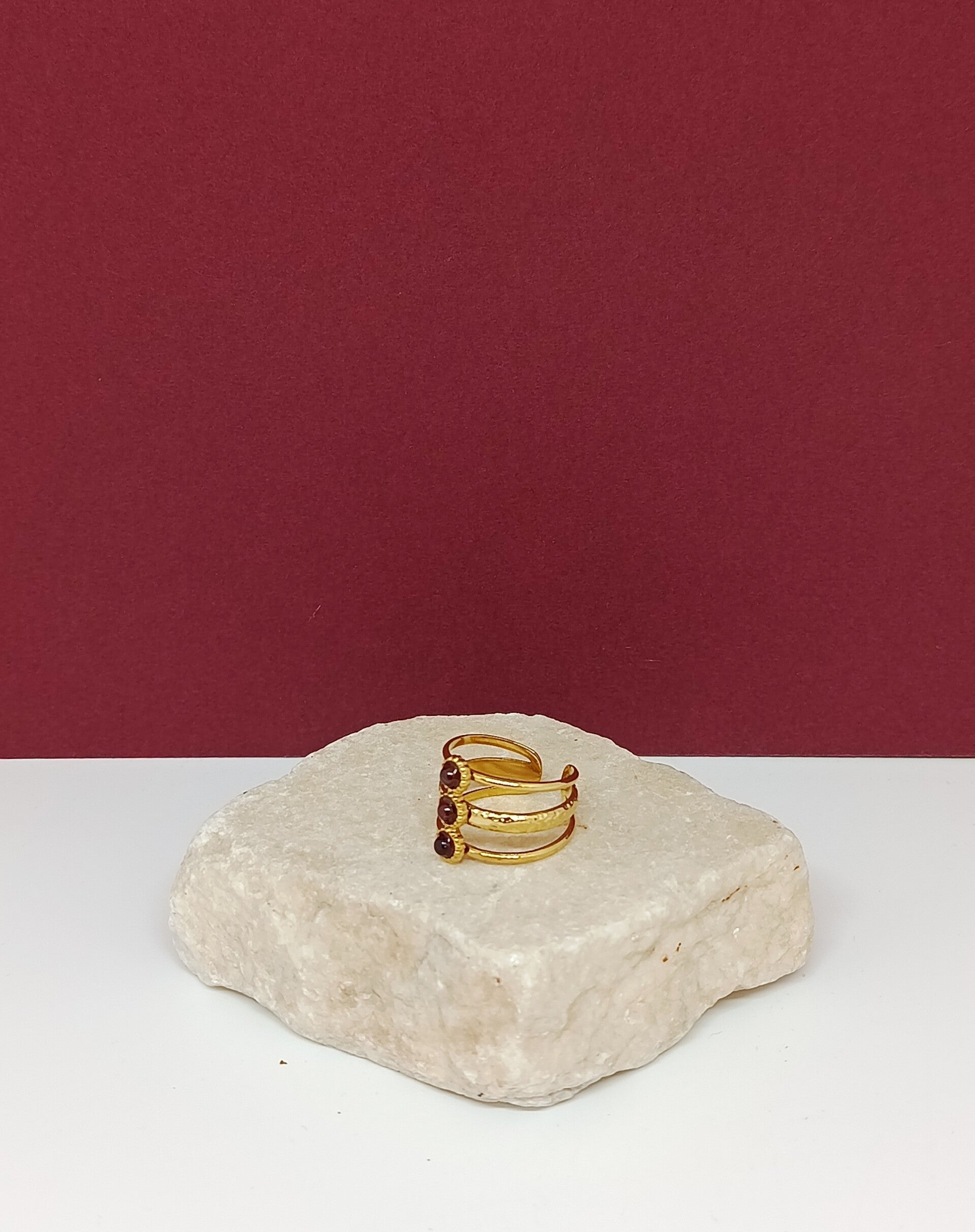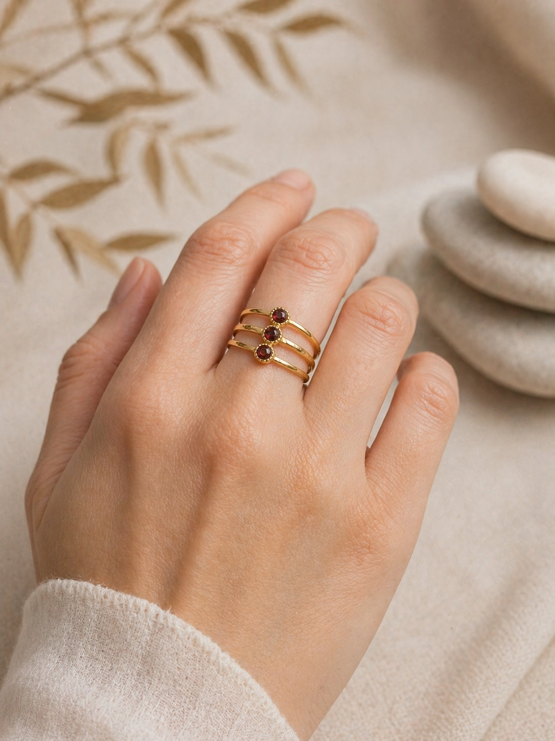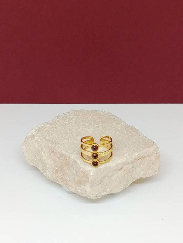 Élégante et délicate, cette bague en acier inoxydable multi rangs doré est ornée de pierres de grenat aux reflets rouges profonds, soigneusement serties à la main. Chaque pierre, en cabochon de 3 mm, révèle des nuances naturelles uniques qui apportent caractère, intensité et authenticité à ce bijou intemporel.