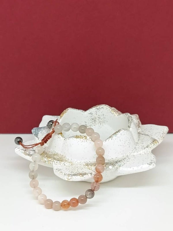Composé de pierres de lune multicolores de 6 mm, ce bracelet dévoile un dégradé subtil allant du blanc lumineux aux tons orangés, en passant par des nuances grisées douces. Cette palette naturelle évoque les différentes facettes de la féminité, de l’émotion et de l’intuition.