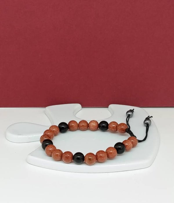 Au centre, une pierre d’onyx noire de 8 mm incarne la stabilité, la protection et la force intérieure. Elle est accompagnée d’un rythme harmonieux alternant onyx noir et perles scintillantes marron doré, qui apportent une touche lumineuse et chaleureuse à l’ensemble.