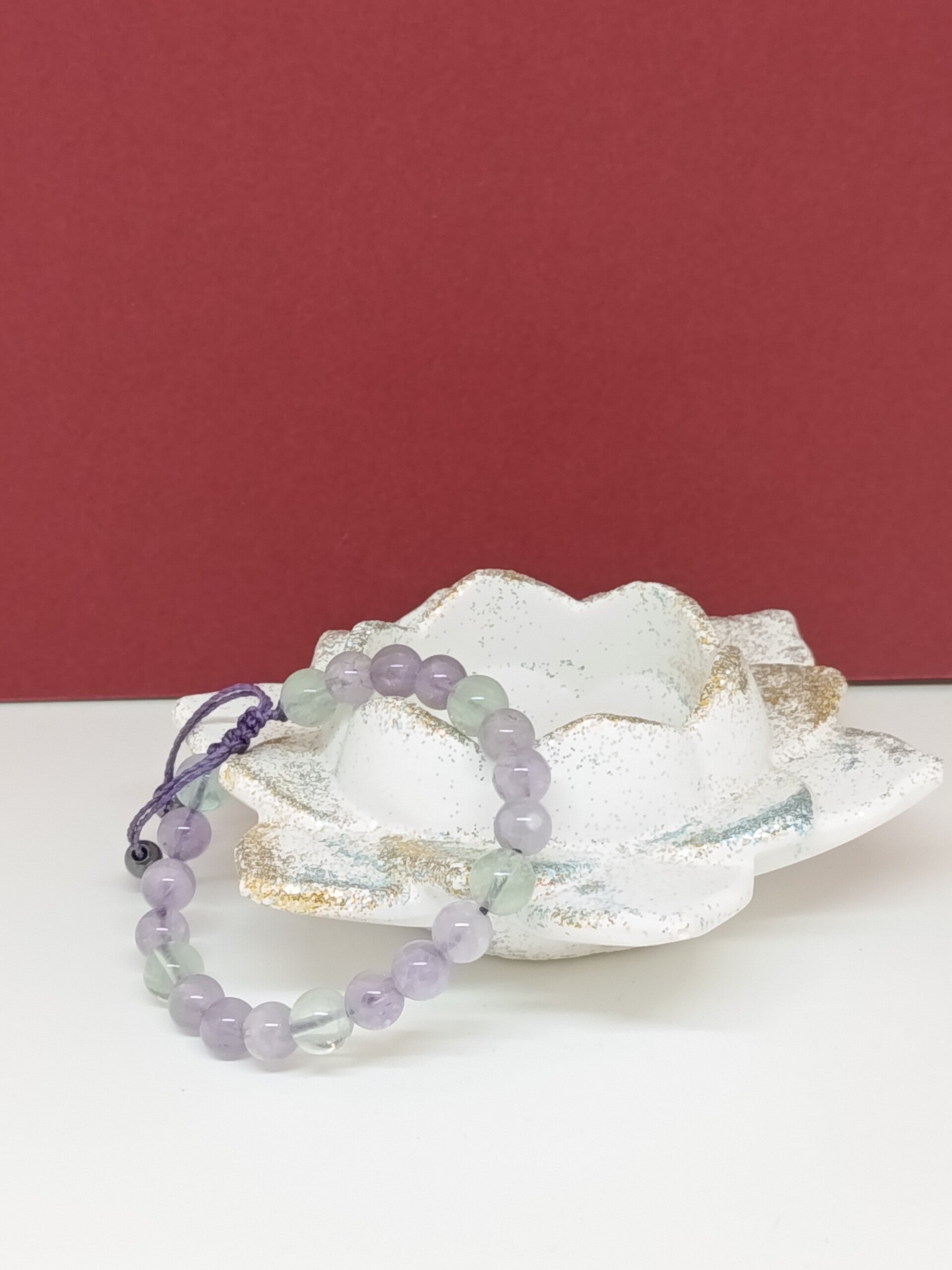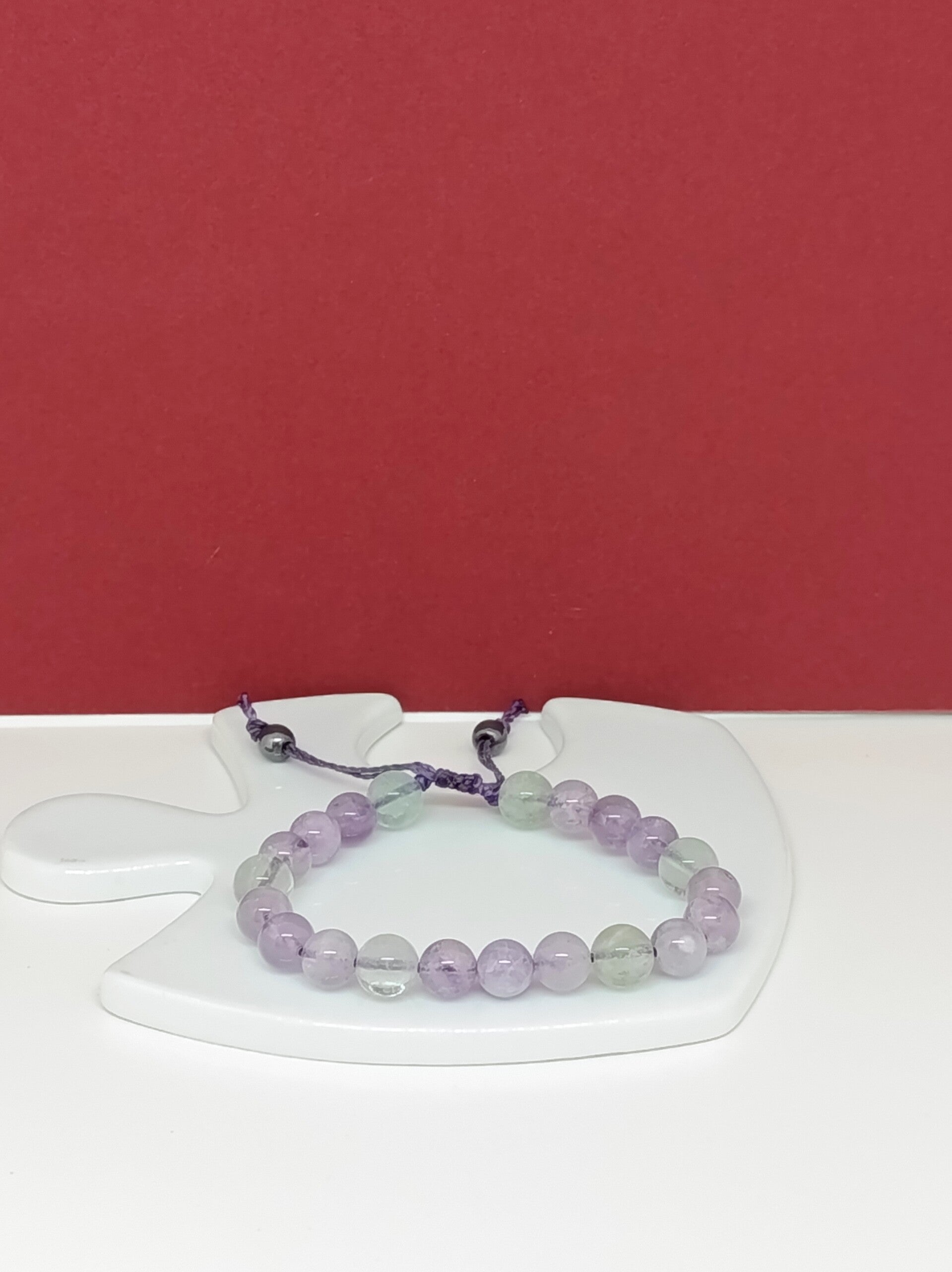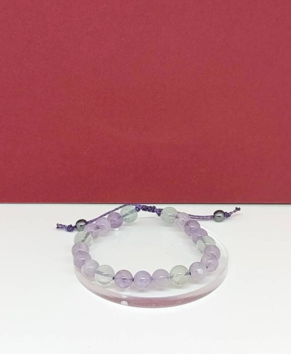 L’ensemble est monté sur un fil linhesita violet, renforçant l’unité et la douceur de la composition. La finition en hématite de 6 mm apporte ancrage, stabilité et équilibre, venant structurer l’énergie globale du bracelet.