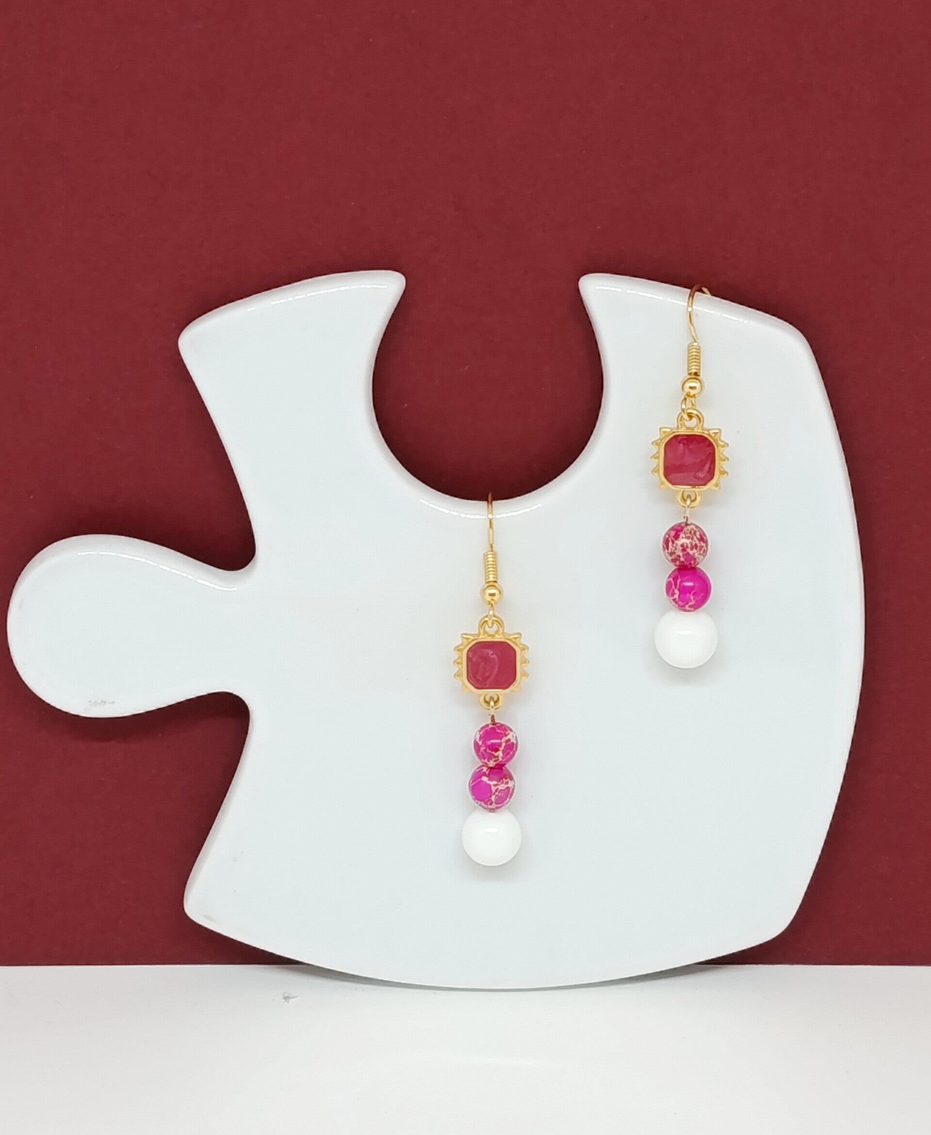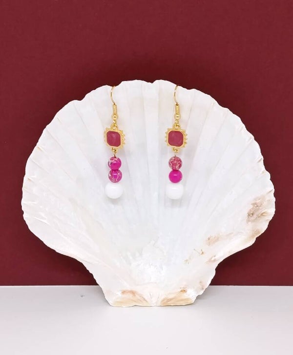 Elles se composent d’attaches en acier inoxydable doré, d’une breloque carrée ciselée ornée d’une résine fuchsia lumineuse, suivie de deux perles d’œil de tigre rose (6 mm) et d’une agate blanche (8 mm) pour une touche douce et harmonieuse.