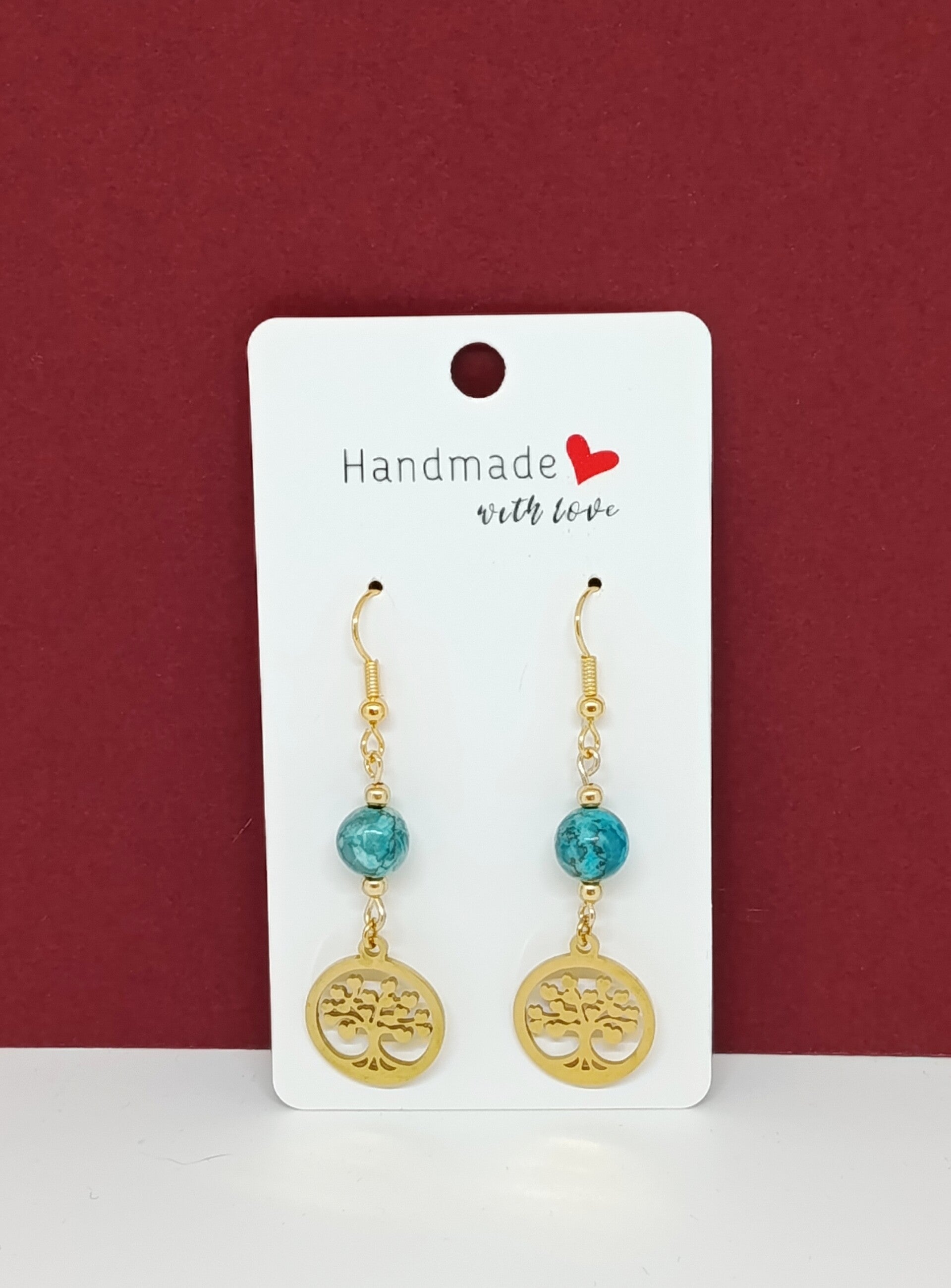 Elles se composent d’attaches en acier inoxydable doré, d’une magnifique pierre de turquoise d’Afrique aux nuances bleu turquoise profond et éclatant, puis d’une délicate breloque ronde dorée représentant un arbre de vie, symbole fort d’ancrage et de croissance.