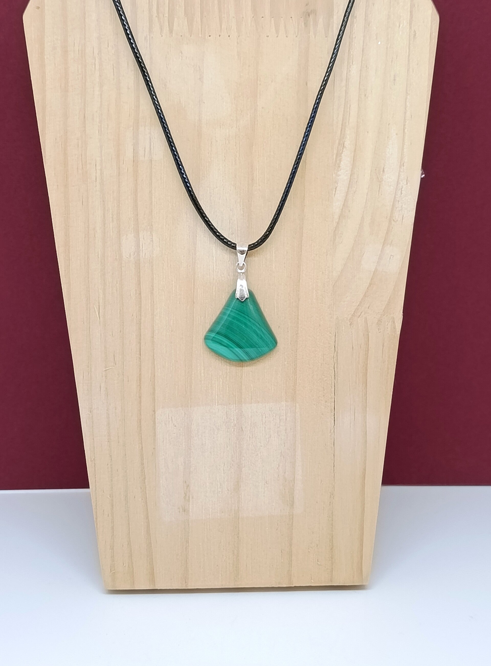 Pendentif Malachite – Forme Triangle Arrondi – Bijou artisanal – Cordon ciré noir Eclat de Forêt