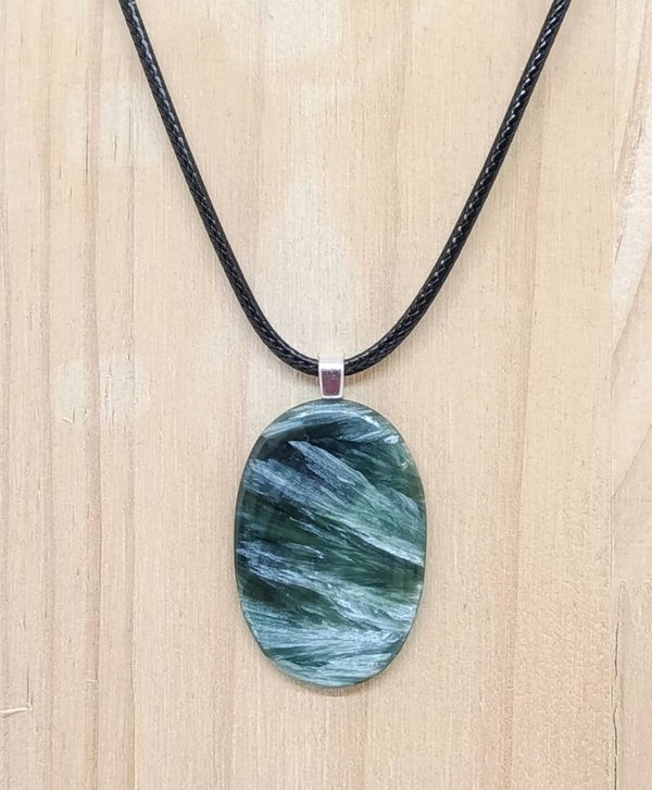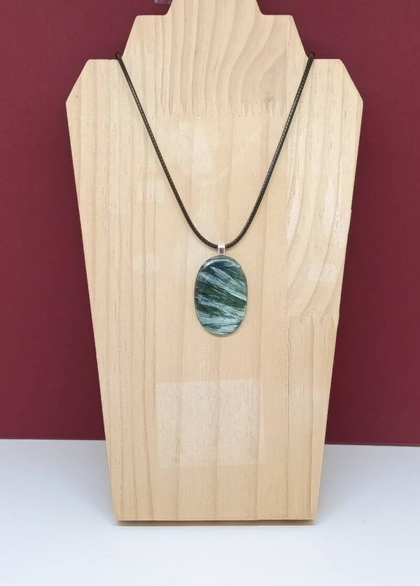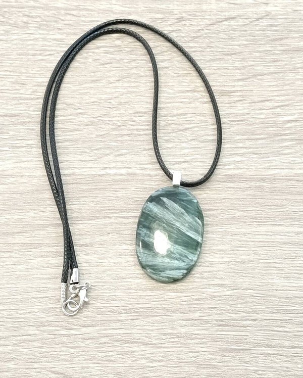 Pendentif Séraphinite – Forme Ovale – Bijou artisanal – Cordon ciré noir Soufle céleste