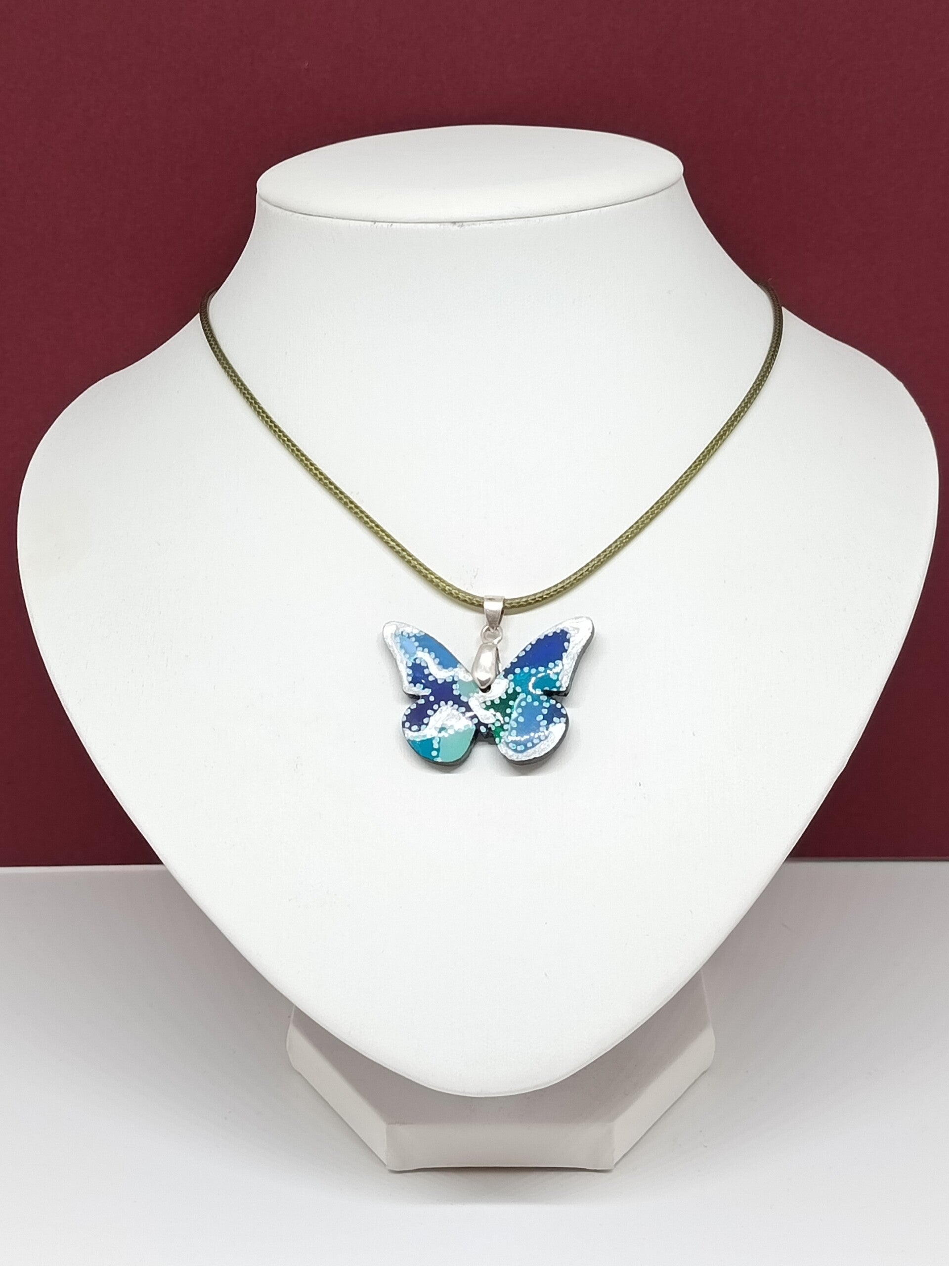 Pendentif Papillon en Bois Peint à la Main Bleu Turquoise, Bleu Marine, Bleu Clair & Blanc – Bijou artisanal unique – Cordon kaki 45 cm – Évasion Céleste