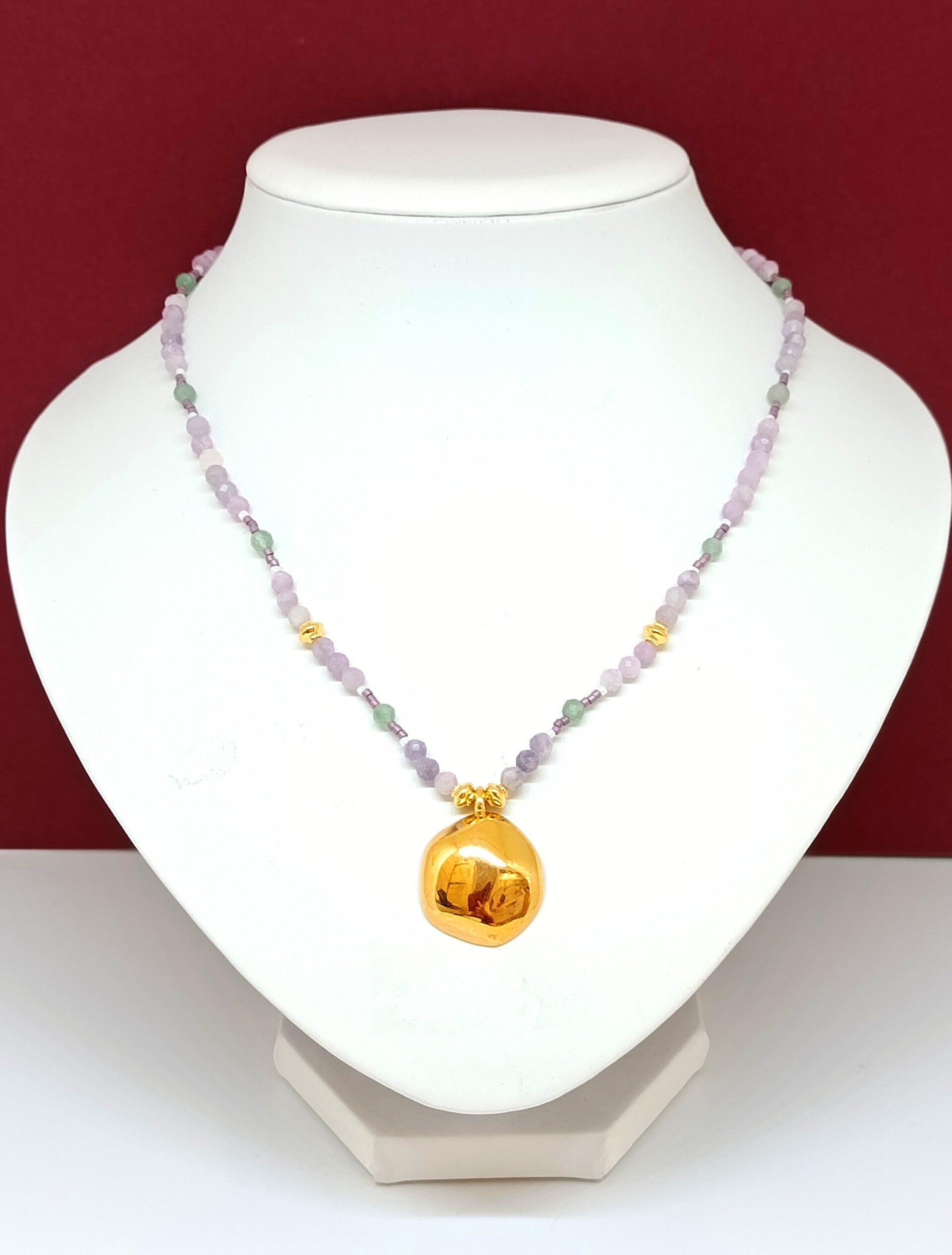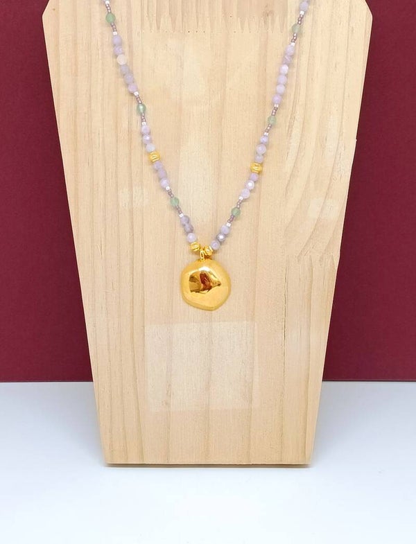 Laissez-vous tenter par ce collier fait main en pierres naturelles, une création délicate aux nuances douces de violet et de vert, pensée comme une harmonie subtile et apaisante.