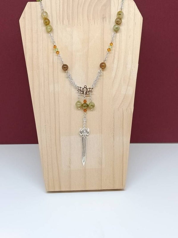 Collier Lotus Sacré & Épée – Grenat Vert & Cristaux – Bijou artisanal médiéval Lotus de l'âme