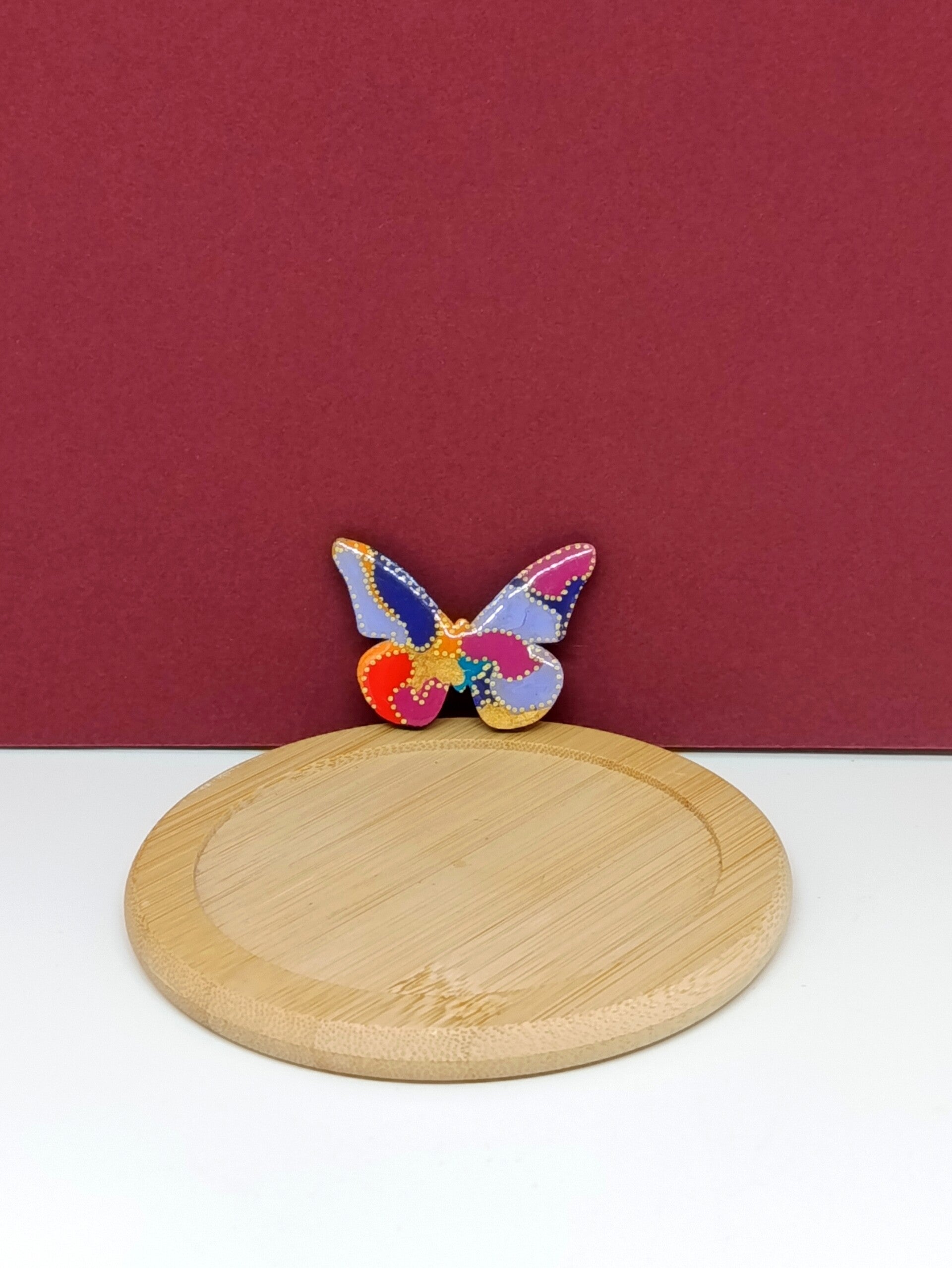 Ce petit papillon en bois, d’environ 3,5 cm de hauteur et 3,5 cm de largeur, est peint à la main dans une palette lumineuse et chaleureuse mêlant orange, violet clair, rose fuchsia, doré, rouge, parme, turquoise et violet foncé. Une composition riche et vibrante, à la fois douce et éclatante.